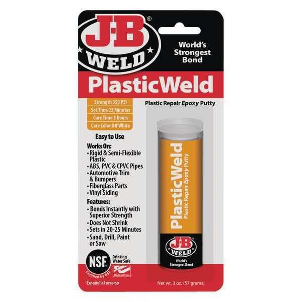 Epoxy Adhesive, Container Type Stick, Cure Method Ambient, Cured Color Off-White, Features Fast-Setting, Included Components Resin and Hardener, Interior/Exterior Interior/Exterior, Low Odor No, Marine Grade No, Materials Bonded ABS Plastic, Ceramic, Composite, Fiberglass, Plastic, PVC, VOC Content Weight Percentage Less Than 1 Percent, Water Resistance Not Water-Resistant, Working Time 20 min, Maximum Application Temperature 120 Degrees F, Maximum Performance Temperature 200 Degrees F