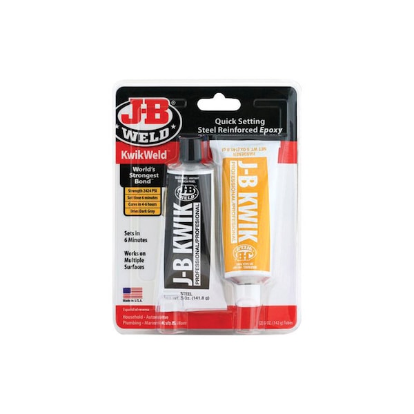 J-B Weld KwikWeld is a fast setting version of The Original J-B Weld two-part epoxy cold weld system that provides strong, lasting repairs to metal and multiple other surface types. After mixing, it forms a permanent bond and can be shaped, tapped, filed, sanded and drilled after curing. J-B KwikWeld has a 1:1 mixing ratio, sets in 6 minutes and is fully cured in 4-6 hours. J-B KwikWeld cures to a dark grey color, is rated at a tensile strength of 3127 PSI and will withstand temperatures up to 230 degrees Fahrenheit.