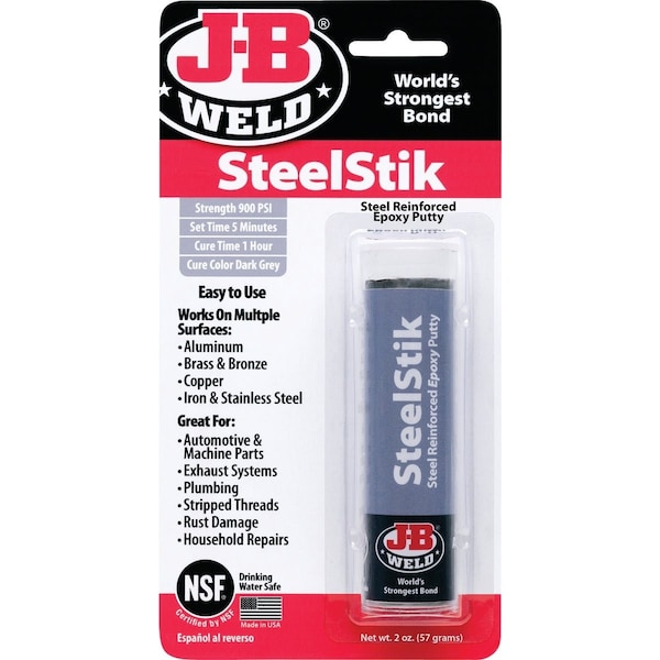 SteelStik is a hand-mixable steel-reinforced non-rusting epoxy putty that quickly repairs or rebuilds anything made of metal. After mixing it forms an industrial-strength polymer compound that can be molded into shapes or used to build up patch and repair steel components. SteelStik sets in 3 to 5 minutes and after 60 minutes can be drilled tapped machined ground filed and painted. SteelStik cures to a dark gray color is rated at a tensile strength of 900 PSI and will withstand temperatures up to 300 degrees F. Use on: automotive brick ceramic concrete metal under water/wet and more.