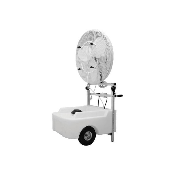 Oscillating portable misting fans portable misting fans include 4 misting nozzles; each provides 0.5 gph and independent control to maintain proper cooling level. Lightweight tubular aluminum frame includes 8in tires for easy transport. Swamp cooler fans fold down to 33inh x 39ind for storage. Included 22 gallon water tank provides 5-8 hours of cooling. High velocity/volume airflow and misting provides a temperature drop of up to 20f plus cooling effect of moving air gives a wind chill effect of 30f. Direct drive 1/3 hp motor and 0.06 amp pump are sealed for long life. Offers both fixed or oscillating fan operation. These swamp air coolers are gfci and thermal overload protected. 2.8 amp. Fan is ul507/ulc listed. Pump is ul/ulc recognized. 115v. 2 year limited warranty. horsepower rating based upon maximum speed/load.