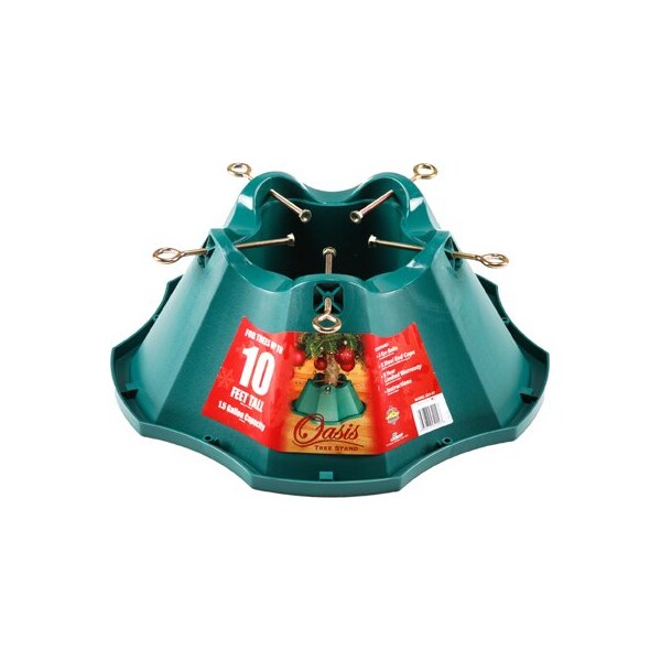 Large Green Heavy Duty Plastic Tree Stand 5 Eye Bolt 1.9 Gallon Water Capacity Holds 10 Tree 21.65 Base Green Plastic With Steel Spike Base Plate Spill Catcher Edge Color Label.