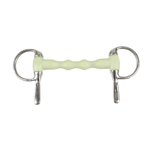 Stainless steel bit with half cheeks and rings and a 5" apple flavored flexible shaped mouth.