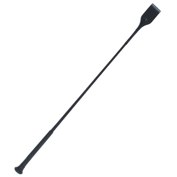 English style bat with molded rubber grip handle, mushroom cap, polyethylene covered fiberglass shaft and leather flap. Available in black only.