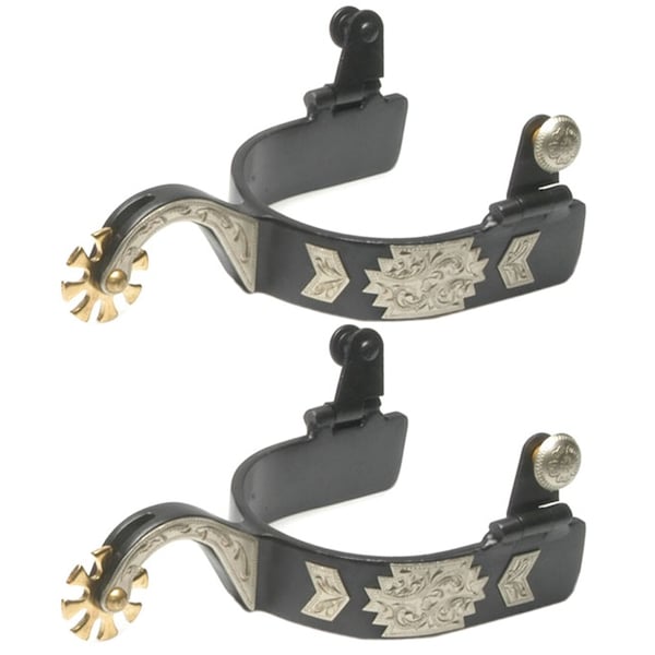 German gold and silver engraved trims, 1" band, 2" shank, and 1-1/4" 8 point rowel and engraved buttons.