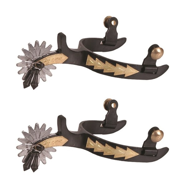Spurs with engraved brass trim, 3/4" band, 2" shank, 2" 16 point stainless steel rowel with jingle bobs and brass buttons.