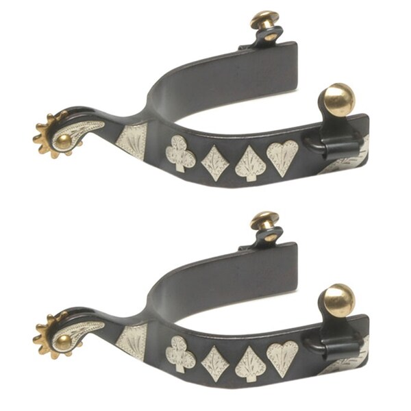 Black steel spurs with engraved German silver playing card trim, 1" band, 1-3/4" shank and 1-1/4" brass 10 point rowel and brass buttons.