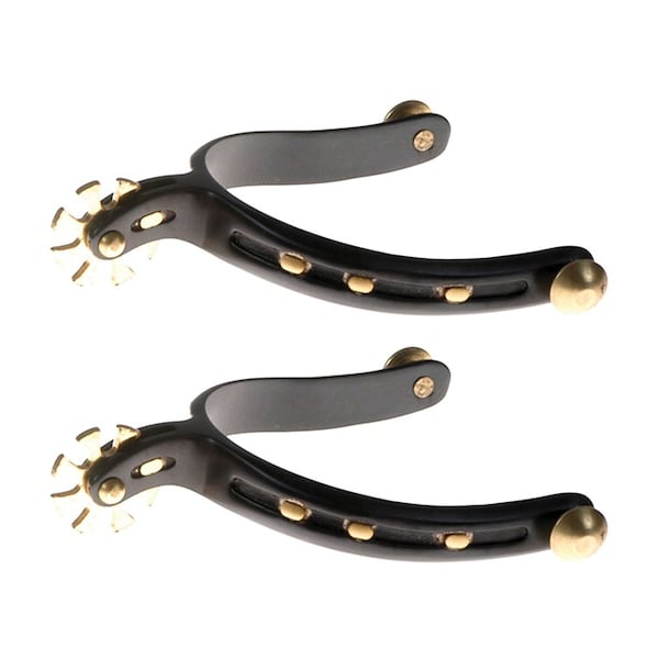 Spurs with 5/8" gun blued horseshoe band with brass horseshoe nail heads, 1-1/8" shank, 1-1/8" 8 point brass rowel and fixed brass buttons.