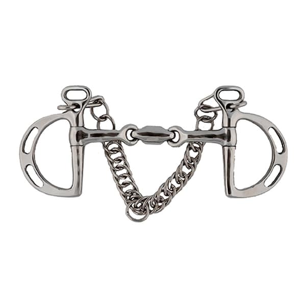 Stainless steel Kimberwick Bit with slotted D rings, curb chain and Elliptical Link Uxeter mouth with thickness of 12mm.