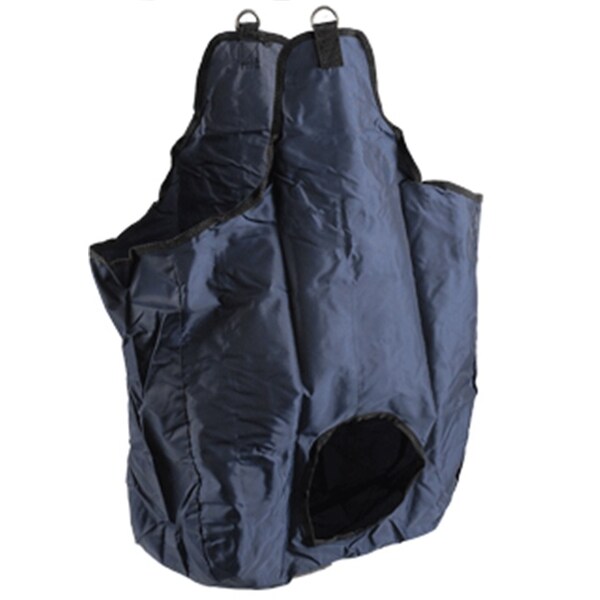 Crafted of 600 denier navy nylon, this hay bag is strong and durable. Metal loops easily attach to a stall or trailer.COLOR MAY VARY.