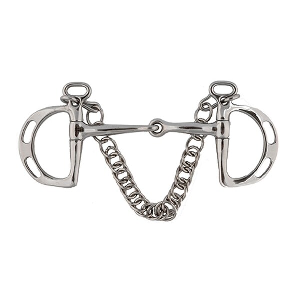 Stainless Steel Kimberwick Bit with slotted D rings, curb chain and a 5" jointed Uxeter mouth with mouth thickness of 12mm.