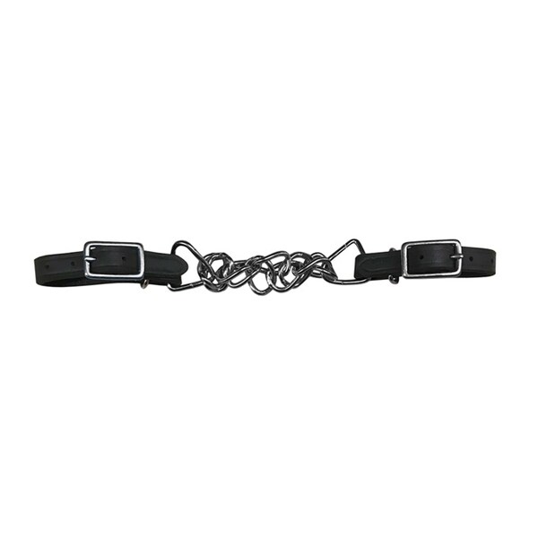 Stainless steel buckles and double link chain with leather straps.