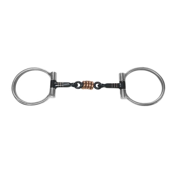 Black steel Offset Dee Snaffle Bit with a 5" copper inlaid double jointed broken mouth with copper wire rollers and 3" rings.