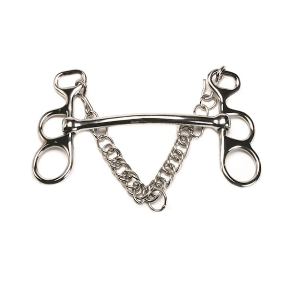 Stainless steel Figure Eight Pelham Bit with mouth thickness of 11mm and 4-3/4" cheeks with stainless steel curb chain.