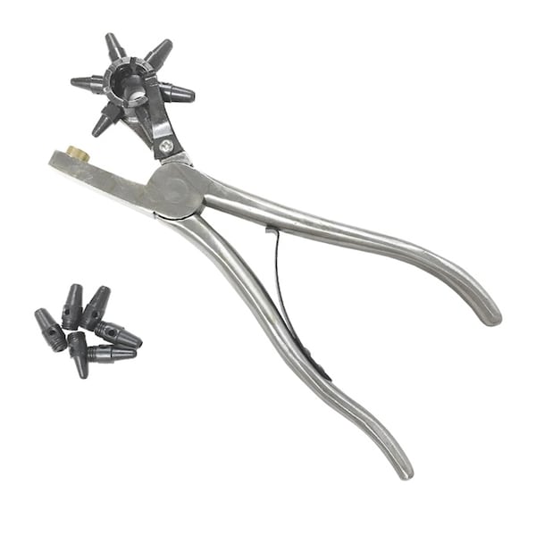 Heavy duty, Stainless Steel Leather Punch has a revolving punch head with 6 tubes. Includes 6 replacement tubes.