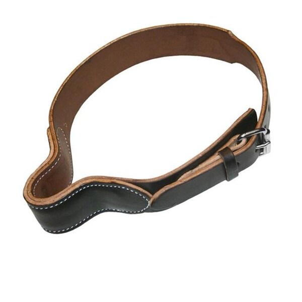 high quality 2 wide leather, covering a steel plate that fits over windpipe area. Dark brown. Horse size. Features- French Cribbing Strap