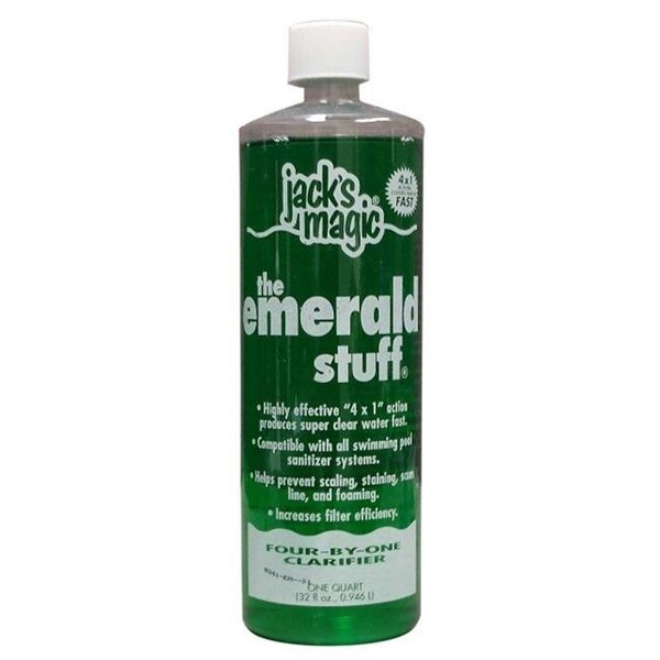 Jack's Magic Products, identify, prevent and remove stains and discoloration by treating stain issues with the pool and spa water. We have built a reputation for innovative quality products and programs that deliver results. All of our solutions are designed with your workday in mind, with performance and savings that are always at work for you. We believe the quality of a product goes hand in hand with innovation. Produces super clear water fast through a highly effective "4 x 1" action: the rich green emerald formulation combines a powerful clarifier, sequestrant, chelating agent, and flocculent in one convenient product. The Emerald Stuff requires no premixing, will not affect pH, and is compatible with all swimming pool sanitizer systems. The Emerald Stuff removes oils, soaps, metals, cosmetics, and other particulate matter that can cause staining, cloudy water, and discoloration. The Emerald Stuff also increases filter efficiency.