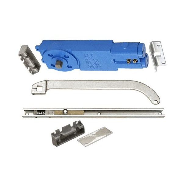 The CRL Jackson 21201 Series Overhead Concealed Closer with S Offset Slide-Arm Hardware Package consists of a Spring Power Adjustable Closer mechanism, which depending on the selected spring size and closer function, is suitable for a range of doors from 30 to 42 762 mm to 1.07 m wide. The Closer is packaged complete with Cat. No. 20951 Mounting Clips, 20942 Offset Arm Package, 20368 Slide Channel, and complete installation instructions. The Closer has dual independent valves for closing operation one valve for closing, one valve for latching. 90Deg and 105Deg, Hold Open and No Hold Open models are available. Closers fit into standard 1-3/4 x 4 or larger header extrusions.