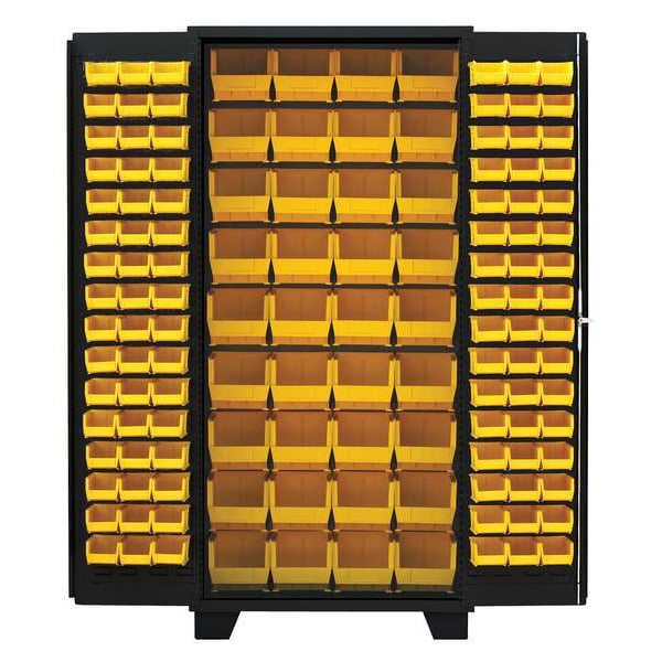 Bin Cabinet, Base Type Legs, Bin Color Yellow, Bin HxWxD (36) 7 in x 8 1/4 in x 11 in, (96) 3 in x 4 1/8 in x 7 1/2 in, Cabinet Color Black, Cabinet Storage Components Bins, Door Type Flush, Frame Assembled Assembled, Mobility Stationary, Number of Bins 132, Number of Cabinet Bins 36, Number of Door Bins 96, Number of Shelves 0, Overall Depth 24 in, Overall Height 78 in, Overall Width 36 in, Bin Depth 7 1/2 in, 11 in, Bin Height 3 in, 7 in, Bin Louvered Panel Location Door, Bin Material Plastic