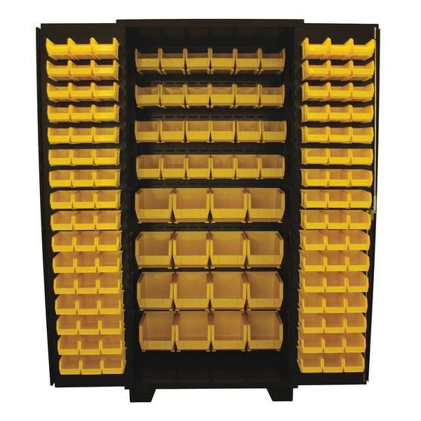 Bin Cabinet, Base Type Legs, Bin Color Yellow, Bin HxWxD (16) 7 in x 8 1/4 in x 11 in, (24) 5 in x 5 1/2 in x 11 in, (96) 3 in x 4 1/8 in x 7 1/2 in, Cabinet Color Black, Cabinet Storage Components Bins, Door Type Flush, Frame Assembled Assembled, Mobility Stationary, Number of Bins 136, Number of Cabinet Bins 40, Number of Door Bins 96, Number of Shelves 0, Overall Depth 24 in, Overall Height 78 in, Overall Width 36 in, Bin Depth 7 1/2 in, 11 in, Bin Height 3 in, 5 in, 7 in
