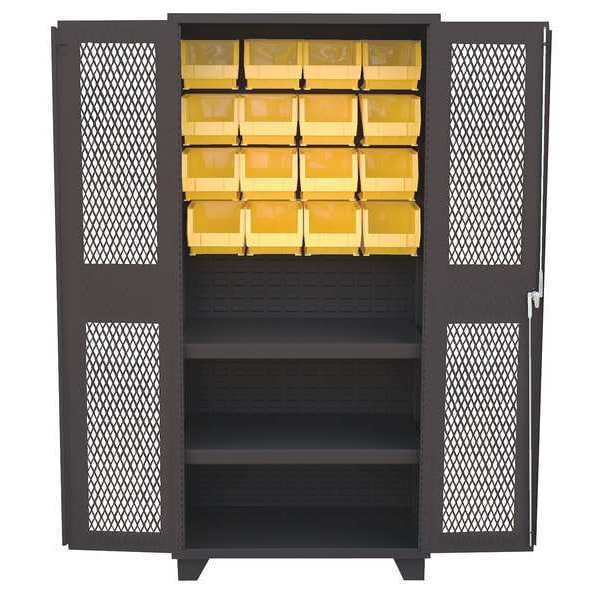Bin Cabinet, Base Type Legs, Bin Color Yellow, Bin HxWxD (16) 7 in x 8 1/4 in x 11 in, Cabinet Color Black, Cabinet Storage Components Bins, Shelves, Door Type Ventilated, Frame Assembled Assembled, Mobility Stationary, Number of Bins 16, Number of Cabinet Bins 16, Number of Door Bins 0, Number of Shelves 2, Overall Depth 24 in, Overall Height 78 in, Overall Width 36 in, Vertical Shelf Clearance (2) 2 1/2 in, Bin Depth 11 in, Bin Height 7 in, Bin Louvered Panel Location Cabinet Back