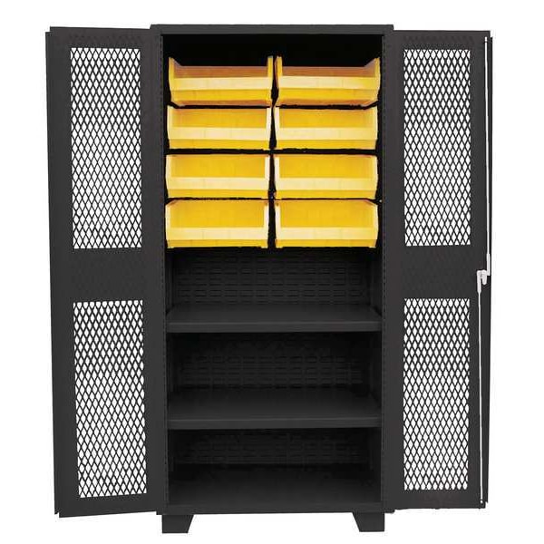 Bin Cabinet, Base Type Legs, Bin Color Yellow, Bin HxWxD (8) 7 in x 16 1/2 in x 14 3/4 in, Cabinet Color Black, Cabinet Storage Components Bins, Shelves, Door Type Ventilated, Frame Assembled Assembled, Mobility Stationary, Number of Bins 8, Number of Cabinet Bins 8, Number of Door Bins 0, Number of Shelves 2, Overall Depth 24 in, Overall Height 78 in, Overall Width 36 in, Vertical Shelf Clearance (2) 2 1/2 in, Bin Depth 14 3/4 in, Bin Height 7 in, Bin Louvered Panel Location Cabinet Back