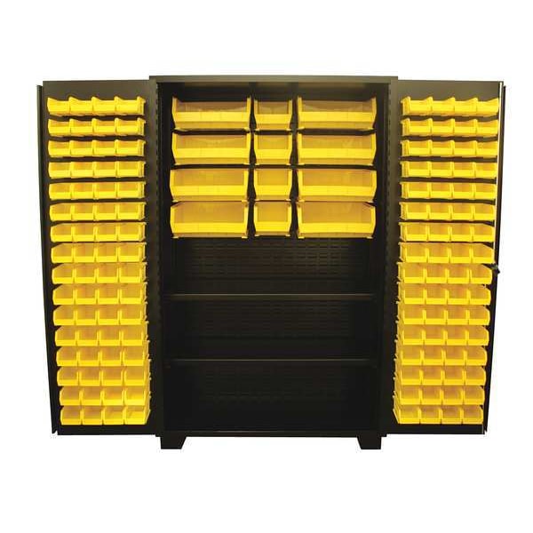 Bin Cabinet, Base Type Legs, Bin Color Yellow, Bin HxWxD (128) 3 in x 4 1/8 in x 7 1/2 in, (4) 7 in x 8 1/4 in x 11 in, (8) 7 in x 16 1/2 in x 14 3/4 in, Cabinet Color Black, Cabinet Storage Components Bins, Shelves, Door Type Flush, Frame Assembled Assembled, Mobility Stationary, Number of Bins 140, Number of Cabinet Bins 12, Number of Door Bins 128, Number of Shelves 2, Overall Depth 24 in, Overall Height 78 in, Overall Width 48 in, Vertical Shelf Clearance (2) 2 1/2 in