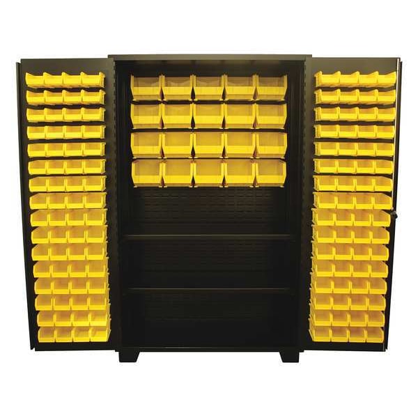 Bin Cabinet, Base Type Legs, Bin Color Yellow, Bin HxWxD (128) 3 in x 4 1/8 in x 7 1/2 in, (20) 7 in x 8 1/4 in x 11 in, Cabinet Color Black, Cabinet Storage Components Bins, Shelves, Door Type Flush, Frame Assembled Assembled, Mobility Stationary, Number of Bins 148, Number of Cabinet Bins 20, Number of Door Bins 128, Number of Shelves 2, Overall Depth 24 in, Overall Height 78 in, Overall Width 48 in, Vertical Shelf Clearance (2) 2 1/2 in, Bin Depth 7 1/2 in, 11 in, Bin Height 3 in, 7 in