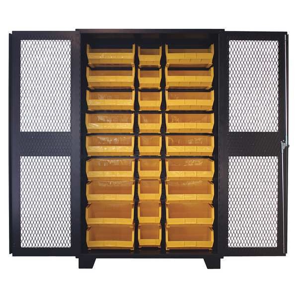 Bin Cabinet, Base Type Legs, Bin Color Yellow, Bin HxWxD (18) 7 in x 16 1/2 in x 14 3/4 in, (9) 7 in x 8 1/4 in x 11 in, Cabinet Color Black, Cabinet Storage Components Bins, Door Type Ventilated, Frame Assembled Assembled, Mobility Stationary, Number of Bins 27, Number of Cabinet Bins 27, Number of Door Bins 0, Number of Shelves 0, Overall Depth 24 in, Overall Height 78 in, Overall Width 48 in, Bin Depth 11 in, 14 3/4 in, Bin Height 7 in, Bin Louvered Panel Location Cabinet Back