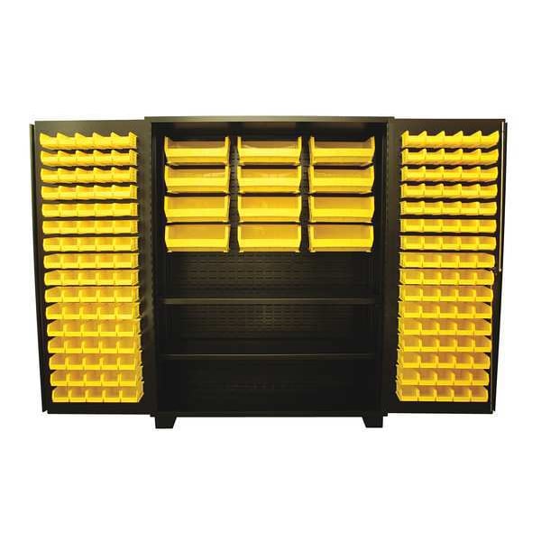 Bin Cabinet, Base Type Legs, Bin Color Yellow, Bin HxWxD (12) 7 in x 16 1/2 in x 14 3/4 in, (160) 3 in x 4 1/8 in x 7 1/2 in, Cabinet Color Black, Cabinet Storage Components Bins, Shelves, Door Type Flush, Frame Assembled Assembled, Mobility Stationary, Number of Bins 172, Number of Cabinet Bins 12, Number of Door Bins 160, Number of Shelves 2, Overall Depth 24 in, Overall Height 78 in, Overall Width 60 in, Vertical Shelf Clearance (2) 2 1/2 in, Bin Depth 7 1/2 in, 14 3/4 in
