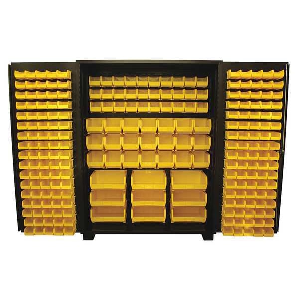 Bin Cabinet, Base Type Legs, Bin Color Yellow, Bin HxWxD (170) 3 in x 4 1/8 in x 7 1/2 in, (21) 7 in x 8 1/4 in x 11 in, (30) 5 in x 5 1/2 in x 11 in, (9) 7 in x 16 1/2 in x 14 3/4 in, Cabinet Color Black, Cabinet Storage Components Bins, Door Type Flush, Frame Assembled Assembled, Mobility Stationary, Number of Bins 230, Number of Cabinet Bins 60, Number of Door Bins 170, Number of Shelves 0, Overall Depth 24 in, Overall Height 78 in, Overall Width 60 in, Bin Depth 7 1/2 in, 11 in, 14 3/4 in