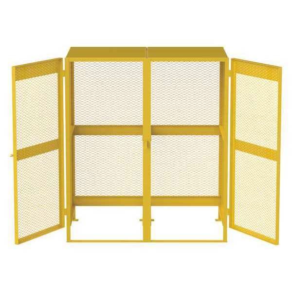 Cylinder Storage Cabinet, Assembled Assembled, Color Yellow, Compatible Tank Size 20 lb to 43 lb, Construction Welded, Cylinder Storage Orientation Vertical, Door Closure Type Manual, Door Construction Mesh, Door Handle Type Slide Bolt Latch, Exterior Depth 40 in, Exterior Height 71 in, Exterior Width 64 in, Finish Powder Coated, Fire Lined Fire Lining Not Included, Horizontal Cylinder Capacity Not Applicable, Includes Predrilled Footpads, Lock Type Not Applicable, Material Steel
