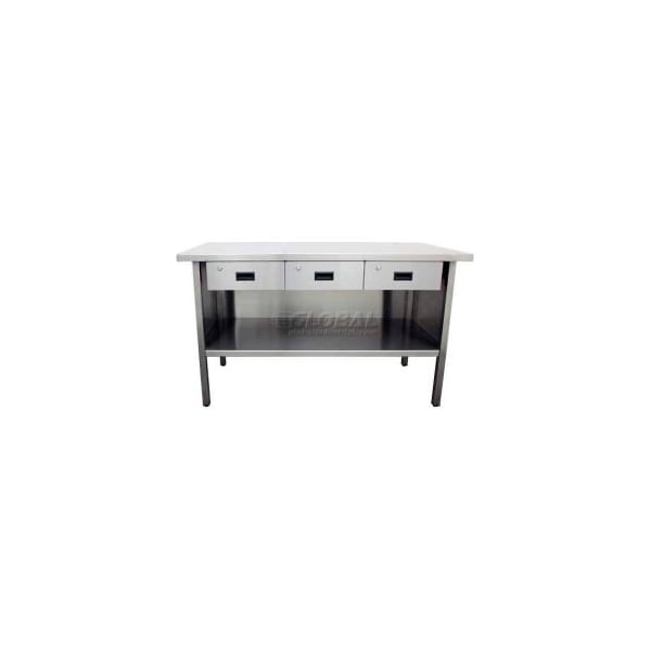The workbench has a fully welded construction in durable 16 gauge premium polished stainless steel. The stainless steel top is double formed around a solid wood core. The base and bottom shelf are inset for ease of use when standing or sitting. The 1-1/2" tubular legs allow for use on uneven surfaces. The 18 gauge one piece stainless steel wrap around shell minimizes loss by closing off the back and sides. It includes 3 stainless steel drawers placed side by side for storage of small parts (2 keys included). The clearance is 19". The overall height is 35".