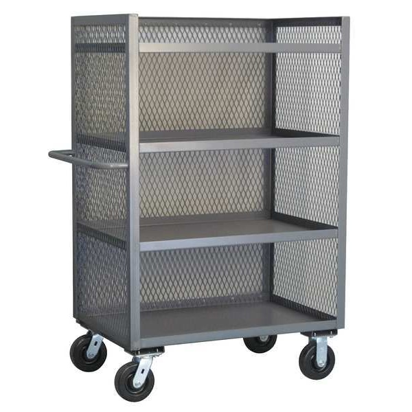 Single-Side-Access Mesh-Wall Metal Stock Truck, Load Capacity 3,000 lb, Number of Shelves 4, Shelf Length 48 in, Shelf Width 30 in, Caster Wheel Dia. 6 in, Caster Wheel/Tread Material Phenolic, Caster/Wheel Configuration (2) Rigid, (2) Swivel, Caster/Wheel Mounting Location Standard, Distance Between Shelves 13 in, Finish Powder Coated, Handle Type Flat, Material Steel, Overall Length 30 in, Overall Width 48 in, Overall Height 57 in