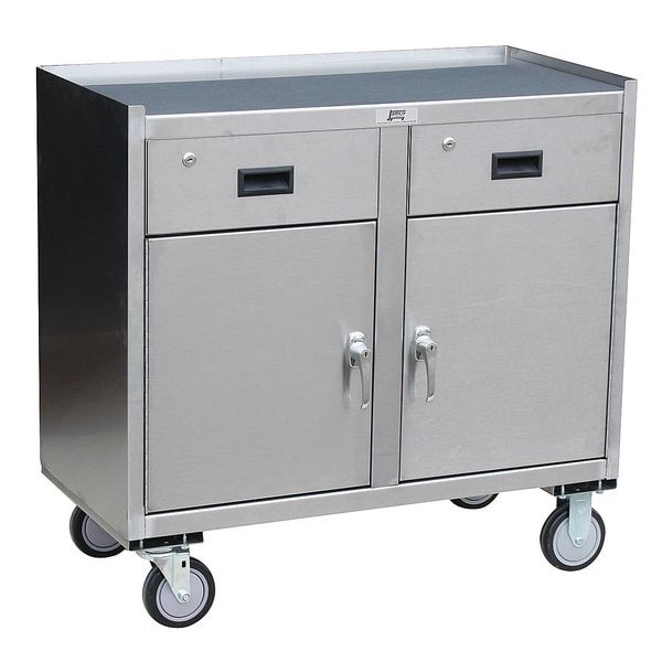 Mobile Cabinet Workbench, Top Material Stainless Steel, Color Silver, Non-Metal Top Thickness Not Applicable, Number of Doors 2, Number of Drawers 2, Number of Shelves 2, Overall Depth 27 in, Overall Height 34 in, Overall Load Capacity 1,200 lb, Overall Width 37 in, Top Metal Material Gauge 16 ga, Included Components Drawers, Upper Shelf, Assembly Fully Assembled, Brake Type None, Cabinet Interior Depth 24 in, Caster Mount Type Plate, Caster Type (2) Rigid, (2) Swivel, Door Type Standard/Hinged