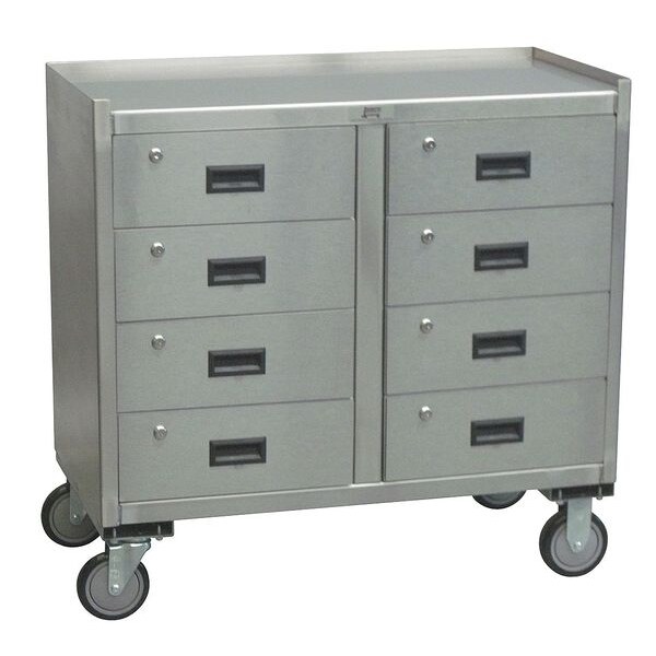 Mobile Cabinet Workbench, Top Material Steel, Color Silver, Non-Metal Top Thickness Not Applicable, Number of Doors 0, Number of Drawers 8, Number of Shelves 0, Overall Depth 19 in, Overall Height 34 in, Overall Load Capacity 1,200 lb, Overall Width 37 in, Top Metal Material Gauge 16 ga, Included Components Drawers, Upper Shelf, Assembly Fully Assembled, Brake Type None, Cabinet Interior Depth 17 in, Caster Mount Type Plate, Caster Type (2) Rigid, (2) Swivel, Door Type Standard/Hinged