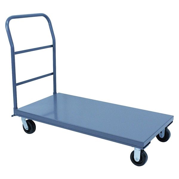 Platform Truck, Load Capacity 2,000 lb, Overall Height 39 in, Overall Length 65 in, Overall Width 31 in, Deck Construction Solid, Deck Material Steel, Deck Finish/Coating Powder Coated, Deck Gauge 12 ga, Deck Height 9 in, Deck Length 60 in, Deck Width 30 in, Deck Surface Smooth, Frame Material Steel, Frame Finish/Coating Powder Coated, Handle Type Removable Raised, Lip Style Flush, Side Panel Type No Side Panels, Number of Platforms 1, Color Gray