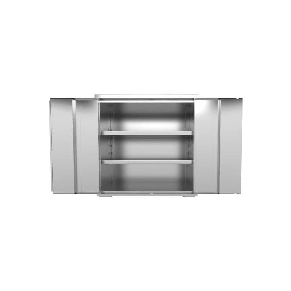 Assembled stainless steel cabinet 48"w x 24"d x 37"h assembled premium polished 304 stainless steel cabinet. 18 gauge stainless steel sides and 12 gauge feet. Two included shelves adjust on 2 1/2" centers. Twin 18 gauge doors have a dual latch system with a flush paddle handle that includes 2 keys. Complete model is 37" tall.