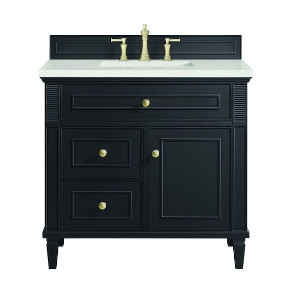 The 36'' Lorelai Single Vanity celebrates timeless form and exquisite finish details, combined with practical function. The rich Black Onyx finish is accented by coin-edge knobs in Champagne Brass which provides an sophisticated contrast. Reeded details, and clean, and raised picture frame molding lend visual interest. This single-door cabinet opens to a spacious interior with a single shelf and a convenient USB/Electric power outlet. Two drawers and an upper tip-out drawer offer additional storage space. The Lime Delight Quartz top lends warm, textured beige tones to perfectly complement the dark finish on the vanity.