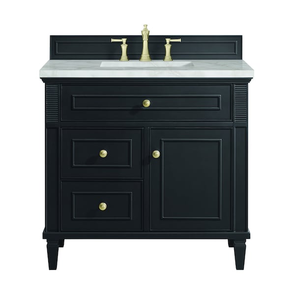 The 36'' Lorelai Single Vanity celebrates timeless form and exquisite finish details, combined with practical function. The rich Black Onyx finish is accented by coin-edge knobs in Champagne Brass which provides an sophisticated contrast. Reeded details, and clean, and raised picture frame molding lend visual interest. This single-door cabinet opens to a spacious interior with a single shelf and a convenient USB/Electric power outlet. Two drawers and an upper tip-out drawer offer additional storage space. The finish is accented by the neutral background of the Victorian Silver Quartz top, boasting champagne metallic accents which seamlessly complete the look.