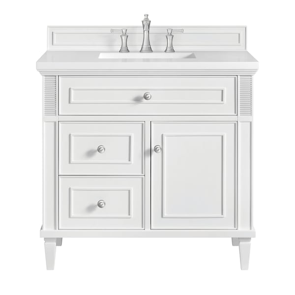 The 36'' Lorelai Single Vanity celebrates timeless form and exquisite finish details, combined with practical function. The sophisticated Bright White finish is accented by reeded details, and clean, raised picture frame molding. Coin-edge knobs in Satin Nickel provide the perfect accent. This single-door cabinet opens to a spacious interior with a single shelf and a convenient USB/Electric power outlet. Two drawers and an upper tip-out drawer offer additional storage space. Choose one of our tops with an undermount rectangular sink to perfectly complete this masterpiece.