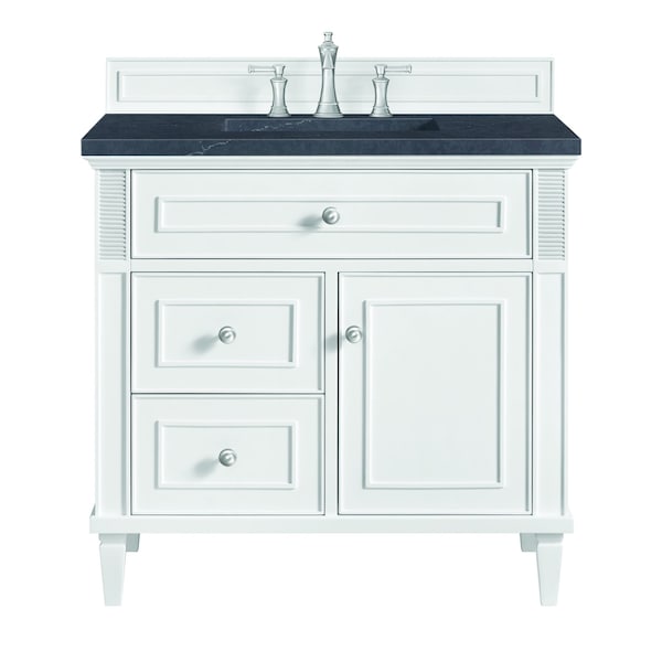 The 36'' Lorelai Single Vanity celebrates timeless form and exquisite finish details, combined with practical function. The sophisticated Bright White finish is accented by reeded details, and clean, raised picture frame molding. Coin-edge knobs in Satin Nickel provide the perfect accent. This single-door cabinet opens to a spacious interior with a single shelf and a convenient USB/Electric power outlet. Two drawers and an upper tip-out drawer offer additional storage space. Completing this piece is a distinguished top, characterized by depth and a sense of movement with a suede finish. The Charcoal Soapstone Quartz top is a timeless statement to complete the look of your vanity.