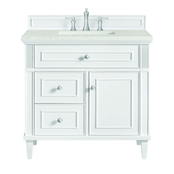 The 36'' Lorelai Single Vanity celebrates timeless form and exquisite finish details, combined with practical function. The sophisticated Bright White finish is accented by reeded details, and clean, raised picture frame molding. Coin-edge knobs in Satin Nickel provide the perfect accent. This single-door cabinet opens to a spacious interior with a single shelf and a convenient USB/Electric power outlet. Two drawers and an upper tip-out drawer offer additional storage space. The Lime Delight Quartz top lends warm, textured beige tones to perfectly complement the finish on the vanity.