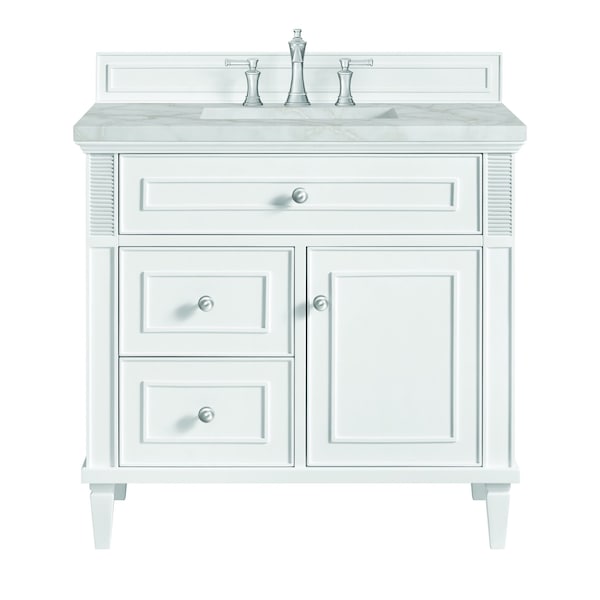 The 36'' Lorelai Single Vanity celebrates timeless form and exquisite finish details, combined with practical function. The sophisticated Bright White finish is accented by reeded details, and clean, raised picture frame molding. Coin-edge knobs in Satin Nickel provide the perfect accent. This single-door cabinet opens to a spacious interior with a single shelf and a convenient USB/Electric power outlet. Two drawers and an upper tip-out drawer offer additional storage space. The finish is accented by the neutral background of the Victorian Silver Quartz top, boasting champagne metallic accents which seamlessly complete the look.