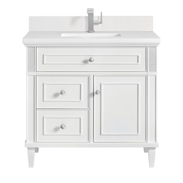 36'' Single Vanity, Bright White w/ Single Hole 3 CM White Zeus Quartz Top & Backsplash