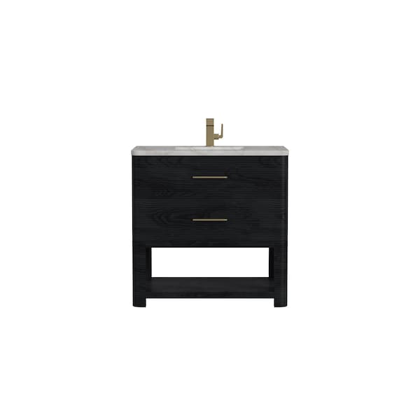 The Lucian 36'' single vanity is a visual symphony, boasting a rich Carbon Oak finish that adds warmth and character to your space. Complemented by Champagne Brass hardware, the ribbed detail is meticulously crafted. Two drawers provide discreet storage, while the lower shelf adds a touch of versatility. With the addition of an elegant Victorian Silver Silestone top and undermount sink, this vanity is a seamless integration of modern design and functionality.