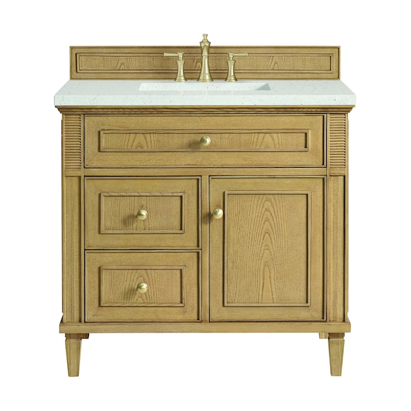 The 36'' Lorelai Single Vanity celebrates timeless form and exquisite finish details, combined with practical function. The Light Natural Oak finish is accented by reeded details, and clean, raised picture frame molding. Coin-edge knobs in Champagne Brass provide the perfect accent. This single-door cabinet opens to a spacious interior with a single shelf and a convenient USB/Electric power outlet. Two drawers and an upper tip-out drawer offer additional storage space. The Lime Delight Quartz top lends warm, textured beige tones to perfectly complement the dark finish on the vanity.
