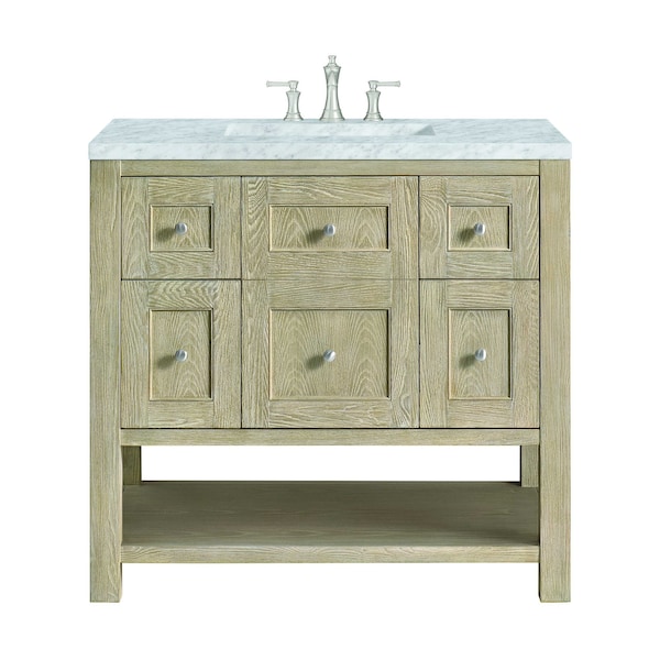 The beautiful Breckenridge 36'' Single Vanity in Whitewashed Oak by James Martin Vanities features round satin nickel knobs that perfectly complement the clean look of this cabinet. The faux-drawer style single door opens to an interior shelf, with convenient access to a built-in USB/electric outlet. Two traditional and two tip-out style top-row drawers add suitable organization. The lower shelf with extra storage for towels and decor completes the cabinet. Completing this vanity are the treasured, neutral tones and textures of the Carrara marble vanity top display an white background with delicate grey veining.