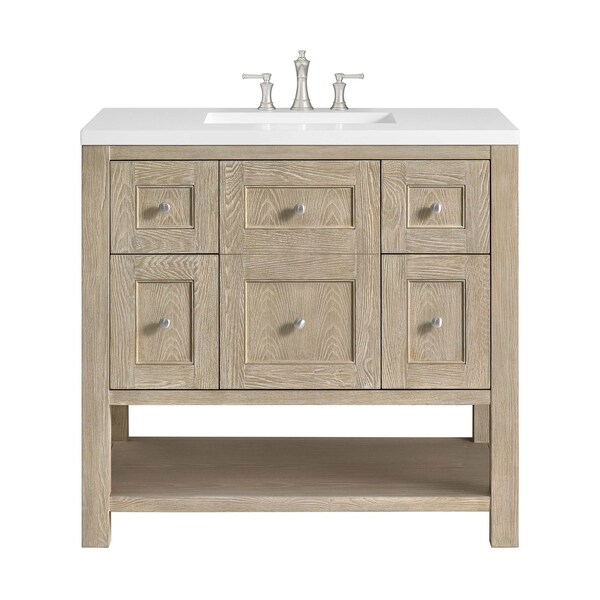 The beautiful Breckenridge 36'' Single Vanity in Whitewashed Oak by James Martin Vanities features round satin nickel knobs that perfectly complement the clean look of this cabinet. The single door opens to an interior shelf, with convenient access to built-in USB/electric outlets. Two traditional and two tip-out style top-row drawers add suitable organization. The integrated lower shelf provides extra storage and completes the look of the cabinet. The 3cm White Zeus quartz top by Silestone is the perfect complement to the warm wood finish.