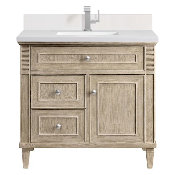 36'' Single Vanity, Whitewashed Oak w/ Single Hole 3 CM White Zeus Quartz Top & Backsplash