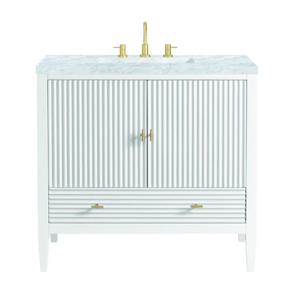 The 36'' Myrrin Single Vanity features a minimalistic silhouette with fluted details, resulting in a blend of classical elegance and contemporary design. The deeply fluted panels run perpendicular on the doors and drawers, adding sophistication and visual interest to the design. Toggle-style knobs in Champagne Brass provide a luxe accent to the rich Bright White finish. The two-door cabinet opens to a spacious interior with a single shelf and a convenient USB/Electric power outlet. A single, lower-level drawer lends additional storage. Completing this vanity, are the treasured, neutral tones and textures of the Carrara marble vanity top display an white background with delicate grey veining.